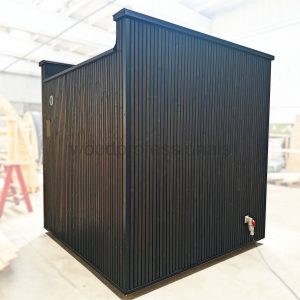 Wall: Thermo-wood panelling from outside: 32 x 142 mm Thermo-wood panelling from inside: 19 mm Structural pine frame: 45 x 95 mm Stone wool insulation: 100 mm Insulated wall thickness: 164 mm
