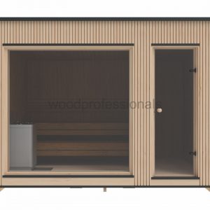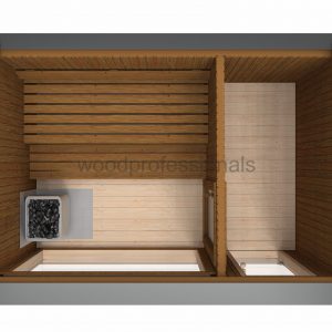 Wall: Thermo-wood panelling from outside: 32 x 142 mm Thermo-wood panelling from inside: 19 mm Structural pine frame: 45 x 95 mm Stone wool insulation: 100 mm Insulated wall thickness: 164 mm